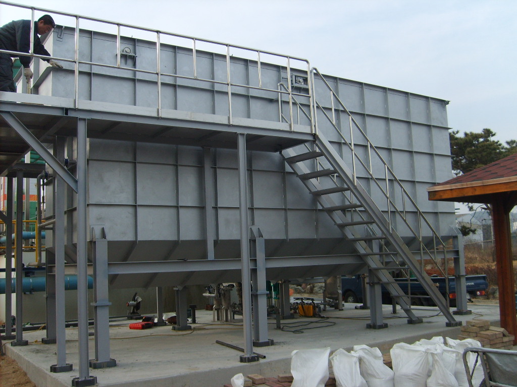 응집반응을 통해 생성된 고형물을 용존공기를 통해 발생한 미세기포에 의해 상층부로 부상시켜 처리하는 설비로 경제성 및 효율성이 뛰어남.